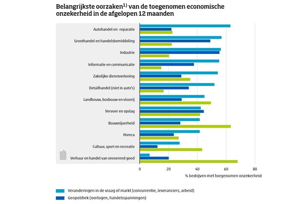 De meest genoemde oorzaken voor de toename van economische onzekerheid verschillen per sector. In de groothandel wordt veranderingen in de vraag of markt het meest aangewezen als de oorzaak (57 procent), gevolgd door geopolitiek (49,2 procent).