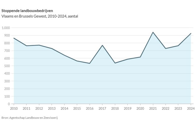 In 2024 zijn in het Vlaamse en Brusselse Gewest 675 landbouwbedrijven gestart, terwijl er 926 bedrijven hun activiteiten hebben stopgezet. Dat blijkt uit cijfers van Statistiek Vlaanderen en het Agentschap Landbouw en Zeevisserij.