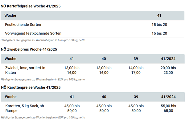 De wortelmarkt in Noord-Oostenrijk is onveranderd ten opzichte van afgelopen week. De oogstvolumes worden nog steeds afgestemd op de vraag. De opslag van wortelen zal naar verwachting volgende week beginnen. De vraag blijft op het gebruikelijke seizoensniveau. De prijzen zijn consistent gebleven met die van vorige week. Begin deze week lagen de prijzen voor wortelen in 5 kg zakken, af helling, meestal tussen de 45 en 50 euro per 100 kg, afhankelijk van de kwaliteit.