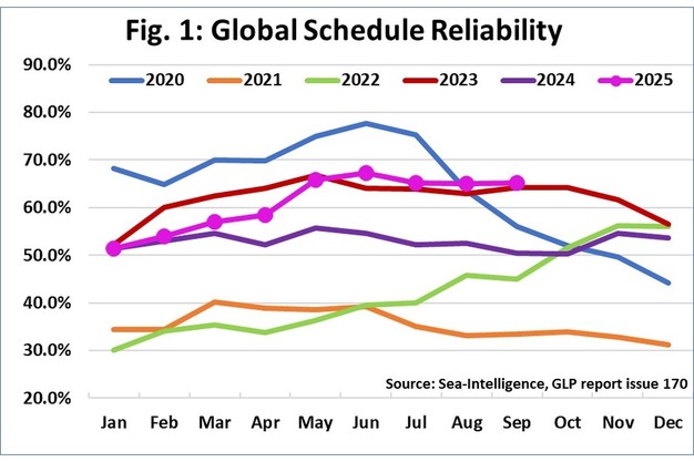 Volgens de nieuwste cijfers steeg de wereldwijde punctualiteit maand-op-maand met 0,1 procentpunt naar 65,2%, het op een na hoogste niveau voor september tussen 2019 en 2025. Op jaarbasis nam de betrouwbaarheid toe met 14,7 procentpunt. De gemiddelde vertraging van te laat aangekomen schepen bleef onveranderd op 4,88 dagen.