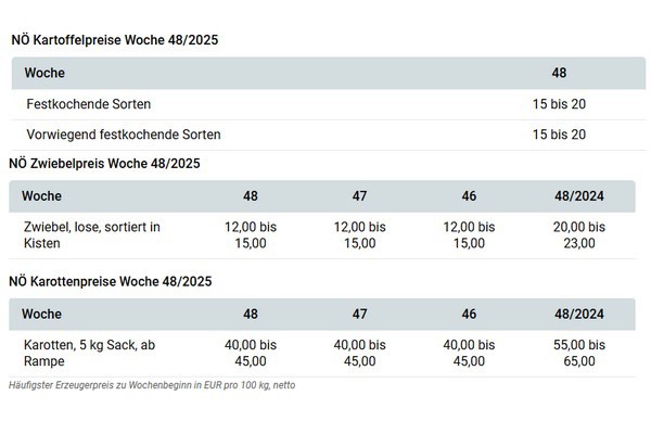 De worteloogst in Neder-Oostenrijk is inmiddels vrijwel volledig afgerond. De totale opbrengst is dit jaar gemiddeld, al zijn er kwaliteitsproblemen door vraatschade van muizen. De binnenlandse afzet verloopt voor de tijd van het jaar rustig, maar gestaag. Export speelt vooralsnog nauwelijks een rol. In prijsopzicht zijn er geen veranderingen ten opzichte van vorige week. Voor wortelen in 5-kilo zakken werd begin deze week, afhankelijk van de kwaliteit, doorgaans tussen de 40 en 45 euro per 100 kilo betaald.