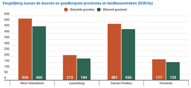 Provinciaal gezien is West-Vlaanderen het duurst: geploegde grond kost daar gemiddeld €526 per hectare, grasland €460 per hectare. In Luxemburg zijn de prijzen het laagst, met €213 per hectare voor geploegde grond en €184 voor grasland.