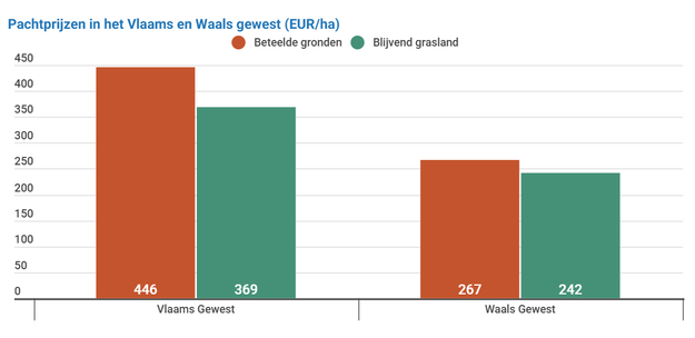 Regionaal zijn de verschillen groot. In Vlaanderen ligt de huurprijs voor geploegde grond gemiddeld op €446 per hectare, in Wallonië op €267 per hectare. Voor grasland liggen de prijzen op respectievelijk €369 en €242 per hectare.