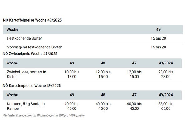 De oogst van de wortelen in Neder-Oostenrijk is inmiddels grotendeels afgerond; de resterende partijen zullen in de komende dagen uit de grond worden gehaald. De markt wordt momenteel door de telers vraaggestuurd beleverd. De binnenlandse afzet verloopt stabiel op seizoensniveau, met prijzen die onveranderd zijn ten opzichte van de vorige week. Aan het begin van de week werd voor wortelen in 5-kg-zakken, af helling en afhankelijk van kwaliteit, meestal 40–45 €/100 kg betaald.