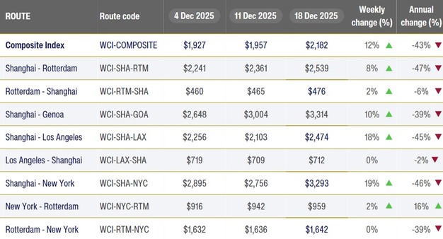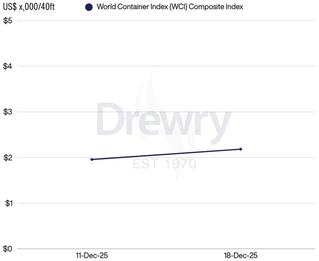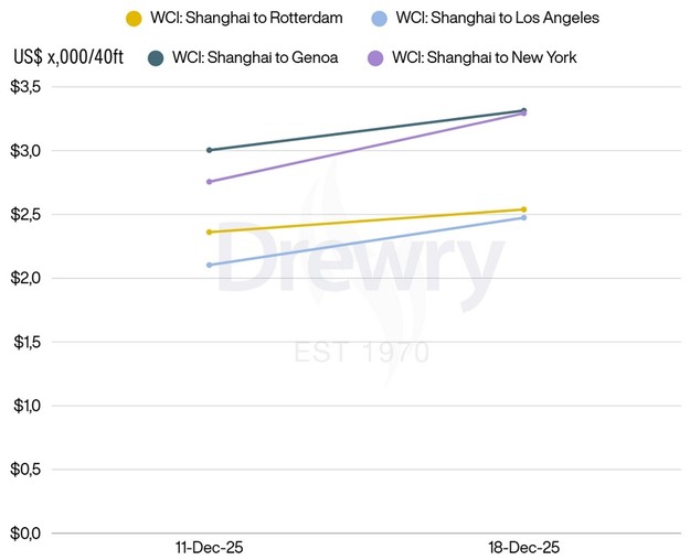 De Drewry World Container Index steeg in de week van 18 december met 12% tot $ 2.182 voor een 40-voets container, goed voor de derde wekelijkse stijging op rij. De stijging werd voornamelijk gedreven door hogere spotprijzen op de Transpacific en Azië-Europa handelsroutes.