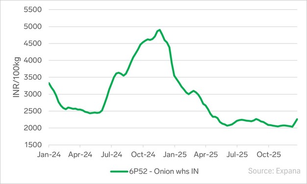 De groothandelsprijzen voor uien in India reageerden op de heropening van de markt van Bangladesh. De prijzen voor groothandelsuien van Indiase herkomst stonden op 30 december op INR 2.270,04 per 100 kg (€21,24). Dit vertegenwoordigde een maand-op-maandstijging van 9,74 procent.