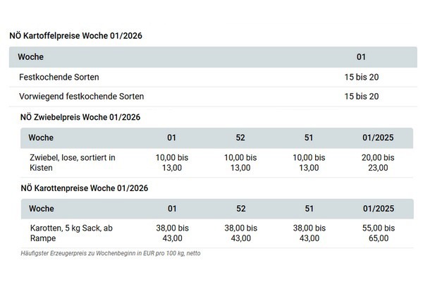 Op de wortelmarkt in Neder-Oostenrijk is de marktsituatie met het begin van het nieuwe jaar nauwelijks veranderd. De binnenlandse afzet verloopt stabiel op een goed gemiddeld niveau. Voor de export gaat nog steeds slechts een geringe hoeveelheid weg, wat rond deze tijd van het jaar niet uitzonderlijk is. De telersprijzen zijn ongewijzigd het nieuwe jaar gestart. Aan het begin van de week werd voor wortelen in 5-kg-zakken, af helling, afhankelijk van kwaliteit, meestal tussen 38 en 43 €/100 kg betaald.