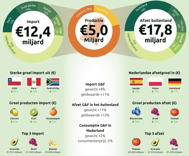 De invoer van verse groenten en fruit bereikte in 2025 een nieuw record. Zo nam het ingevoerde gewicht met 9 procent toe naar 8,1 miljard kilo, met een totale waarde van €12,4 miljard (+11%). Ruim driekwart van de invoer bestaat uit vers fruit. Peru (€1,8 miljard) en Zuid-Afrika (€1,6 miljard) zijn Spanje (€1,5 miljard) voorbijgestreefd als belangrijkste herkomstlanden.