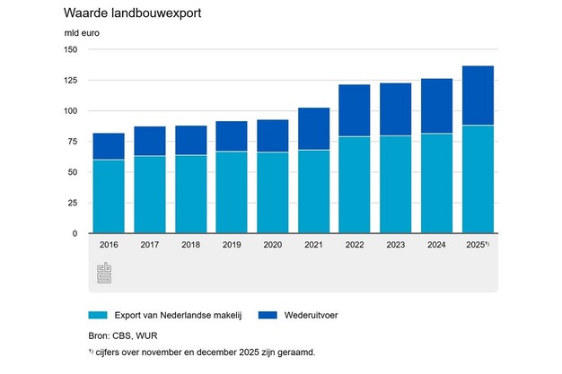 In 2025 heeft Nederland voor 137,5 miljard euro aan landbouwgoederen uitgevoerd. Dat is 8,4 procent meer dan het jaar ervoor. Onder andere de exportwaarde van cacaoproducten is fors gestegen. Dat melden Wageningen Social & Economic Research (WUR) en het Centraal Bureau voor de Statistiek (CBS) op basis van gezamenlijk onderzoek in opdracht van het ministerie van Landbouw, Visserij, Voedselzekerheid en Natuur (LVVN).