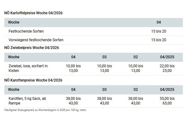 De wortelmarkt in Neder-Oostenrijk vertoont grotendeels geen verandering ten opzichte van de voorgaande weken. De binnenlandse afzet verloopt constant op een goed gemiddeld niveau. Exporten kunnen in beperkte mate plaatsvinden tegen ongewijzigde condities. De producentenprijzen blijven daarmee een verdere week op hetzelfde niveau gehandhaafd. Aan het begin van de week werd voor wortelen in zakken van 5 kg, af helling, afhankelijk van de kwaliteit meestal 38 tot 43 €/100 kg betaald.