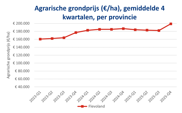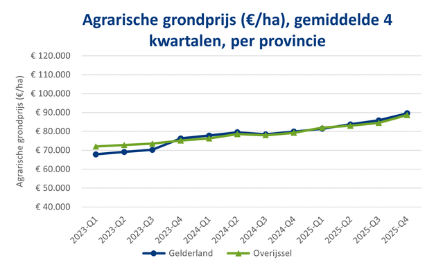 De prijs van agrarische grond in Nederland is in het 4e kwartaal van 2025 sterk gestegen. De prijs ging in 1 kwartaal omhoog met 12,7%. Dat is van € 92.900 in het 3e kwartaal naar € 104.700 per hectare (ha) in het 4e kwartaal. Over heel 2025 kwam de gemiddelde grondprijs uit op € 95.400 per ha. Dat is 11,8% hoger dan in 2024. In dat jaar was de prijs € 85.300 per ha.