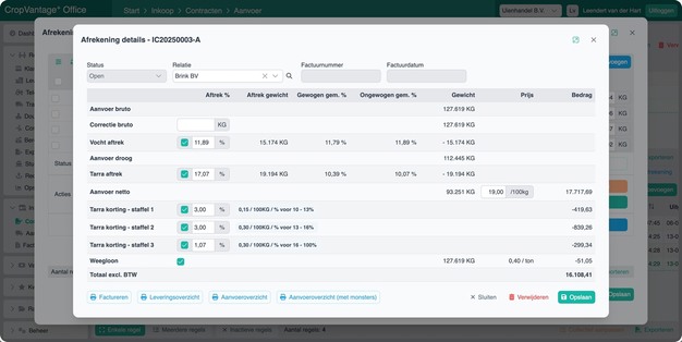 Voorbeeld van een afrekening in CropVantage