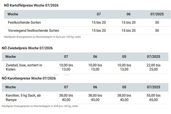 De telersprijzen zijn recent onder druk komen te staan. In Neder-Oostenrijk wordt voor contractaardappelen en premiumkwaliteiten nog tot 20 euro per 100 kg betaald, waarbij risicokortingen en inhoudingen voor logistieke kosten en exportmogelijkheden in rekening worden gebracht. Voor vrije aardappelen worden duidelijk lagere prijzen genoemd. In Opper-Oostenrijk bleef het prijsniveau met 15 euro per 100 kg ongewijzigd ten opzichte van de voorgaande week.
