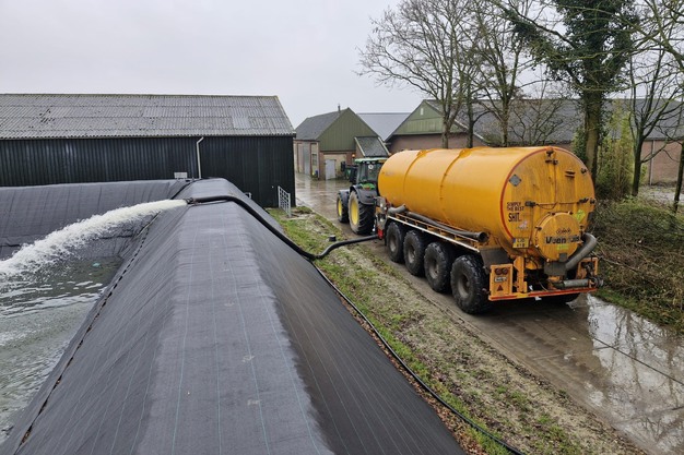 "We hoopten dat ons bassin door de neerslag in de winter flink gevuld zou worden. Eerdere metingen geven aan dat we 1800 tot 2000 m3 water per ha kunnen oogsten en met het water van erf en daken het bassin vol zouden krijgen. Niets is minder waar, want ook deze winter wil de regen niet vallen, zodat we besloten hebben om weer water aan te voeren. Ook voor komend jaar hebben we veel proeven in de planning die water vragen."