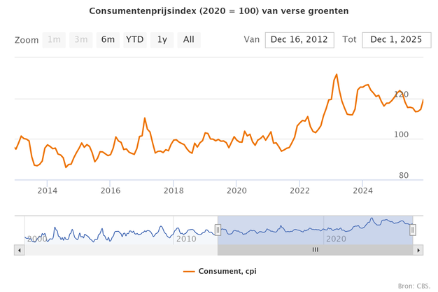 De consumentenprijsindex (CPI) voor aardappelen kwam in november 2025 uit op 116 punten (2020 = 100), ongeveer 8% lager dan een jaar eerder en iets lager dan in september 2025. Hoewel dit de invloed van dalende boerderijprijzen laat zien, blijft de daling in winkelprijzen veel gematigder dan op het niveau van telers. Dat komt doordat consumentenprijzen worden beïnvloed door meerdere factoren, zoals verwerking, logistiek, retailkosten en contractprijsovereenkomsten, waardoor lagere telersprijzen niet volledig worden doorberekend.