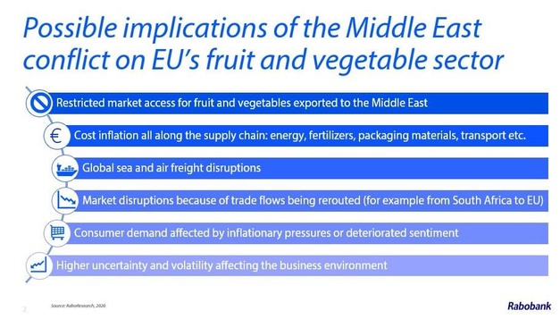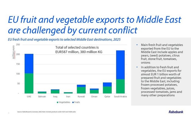 Als voorbeeld van een product dat geraakt wordt, noemt ze de appels. "Er gaan de laatste jaren redelijk wat appels vanuit Europa naar het Midden-Oosten. Als die in Europa blijven, kan dat voor prijsdruk zorgen. Verder zou een effect kunnen zijn dat er meer Egyptisch citrus naar Europa komt en ook de Zuid-Afrikanen waren de laatste jaren hun markten meer aan het spreiden naar het Midden-Oosten en Azië."
