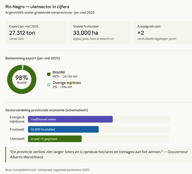 De Argentijnse provincie Río Negro heeft haar areaal voor de uienteelt de afgelopen jaren verdubbeld en is daarmee uitgegroeid tot de belangrijkste uienexporteur van het land. Die groei maakt van de uiensector een belangrijke motor voor de regionale economie, met een directe impact op werkgelegenheid, lokale ontwikkeling en buitenlandse handel.