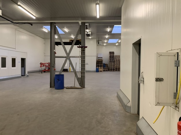 Zeer nette geconditioneerde loods van 800 m² met aparte koelcel.