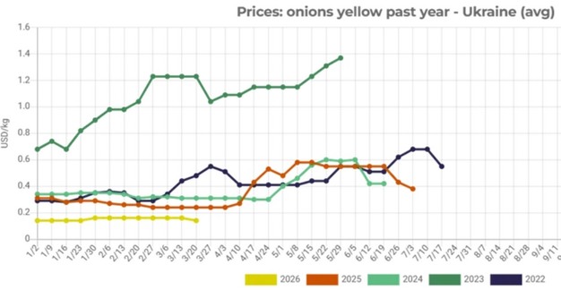 Vergeleken met dezelfde periode vorig jaar liggen de uienprijzen in Oekraïne momenteel ongeveer 49% lager.