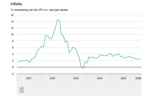 De inflatie in Nederland is in maart 2026 volgens de snelle raming uitgekomen op 2,7 procent, zo meldt het Centraal Bureau voor de Statistiek (CBS). Daarmee ligt het inflatieniveau hoger dan in februari, toen de consumentenprijzen op jaarbasis met 2,4 procent stegen. De snelle raming is gebaseerd op nog onvolledige brongegevens.