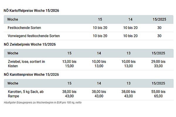 De Neder-Oostenrijkse wortelmarkt is goed in evenwicht. De afzet is over het algemeen bevredigend en de afbouw van de voorraden vordert gestaag. De nadruk ligt daarbij vooral op de binnenlandse markt. Export is eveneens mogelijk, maar blijft qua volume beheersbaar. De prijzen zijn ongewijzigd ten opzichte van de voorgaande week. Aan het begin van de week lagen de prijzen voor wortelen in zakken van 5 kg af helling doorgaans op 38 - 43 euro/100 kg, afhankelijk van de kwaliteit.