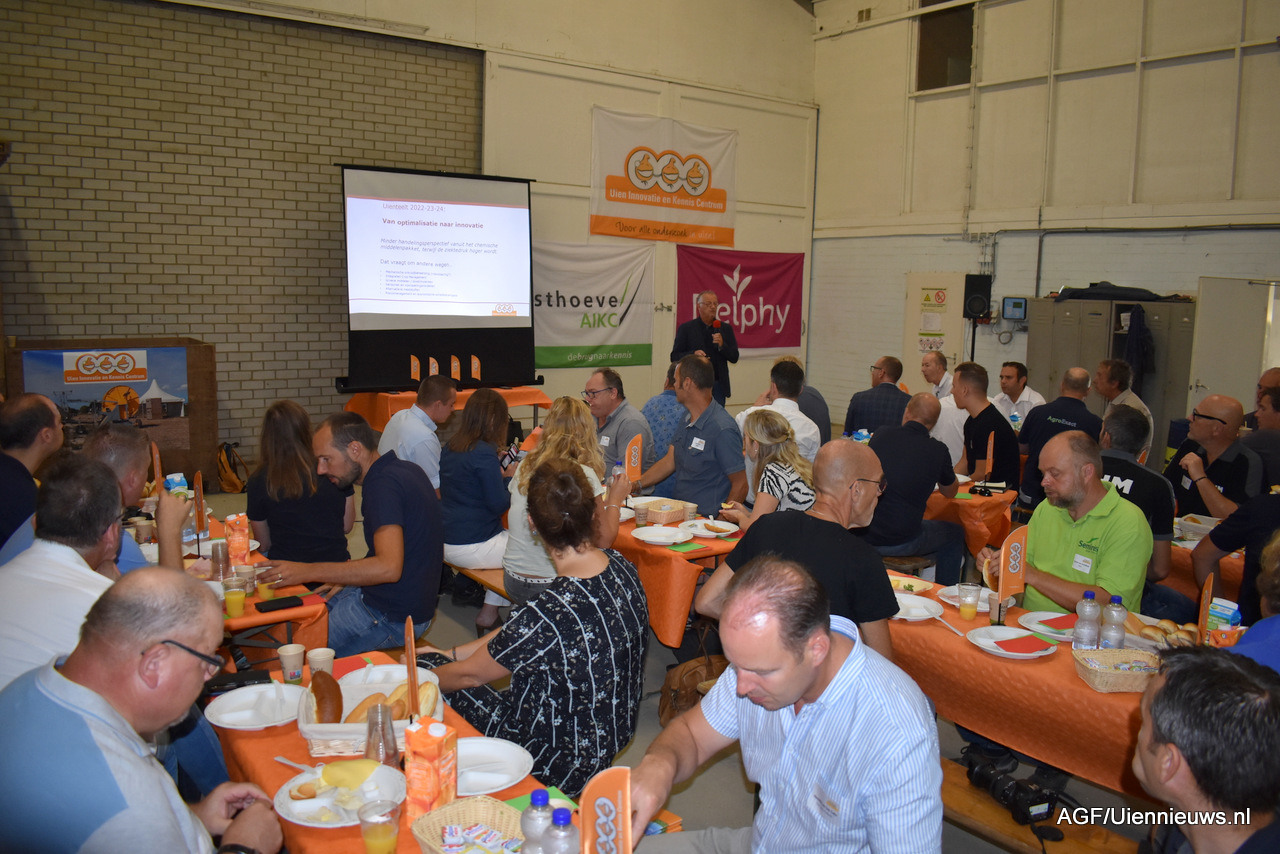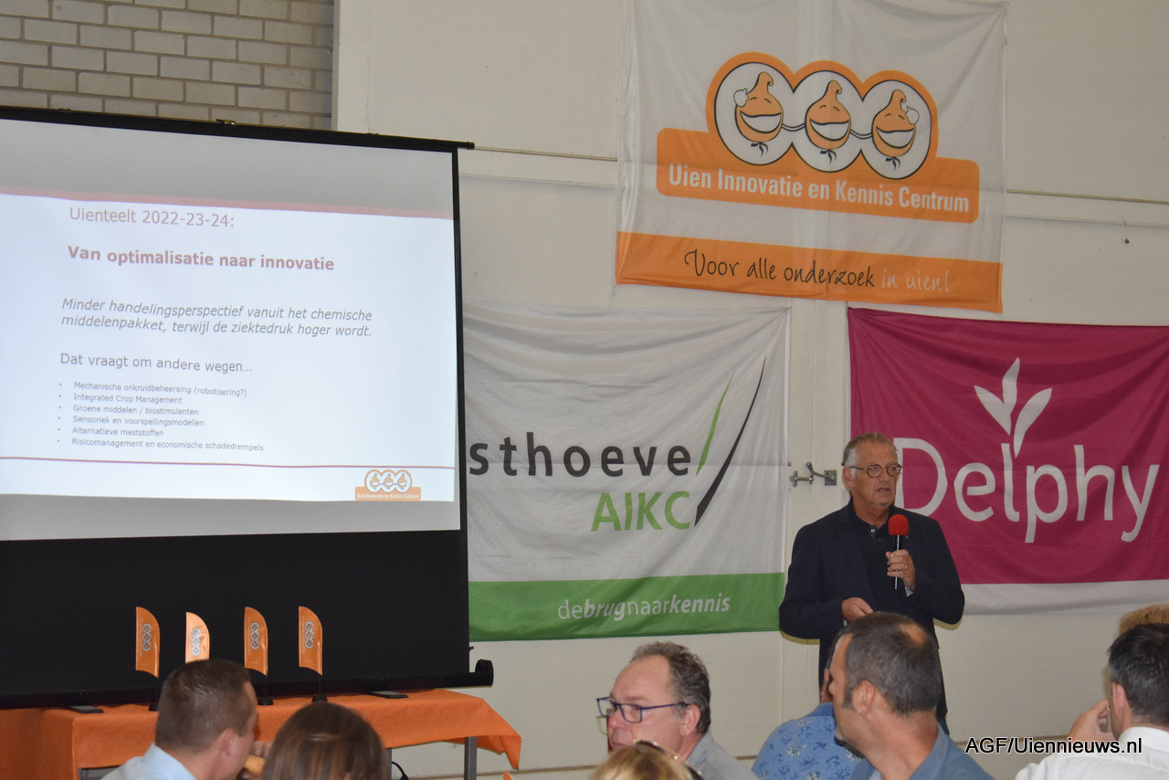 Cor van Oers van het UIKC lichtte de veldonderzoeken toe. Als belangrijke topics in de uienteelt noemde hij klimaatverandering, maatschappij, minder input en een gezond rendement voor de keten. "De maatschappij heeft onduidelijke wensen, maar minimaal nul-emissies en meer biodiversiteit zijn een voorwaarde voor de toekomst."