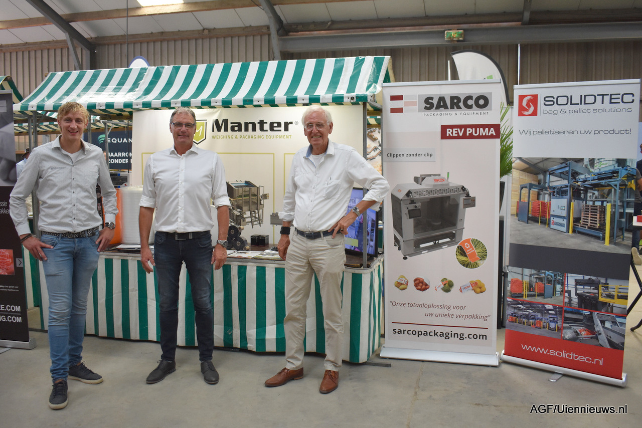 Jarno Habing, Hans Peelen en Willem de Jong vertegenwoordigden Manter, Sarco Packaging en Solidtec. Manter introduceerde onlangs het nieuwe model Autopack: de nieuwste generatie zakaanhanger en halfautomaat op de markt.