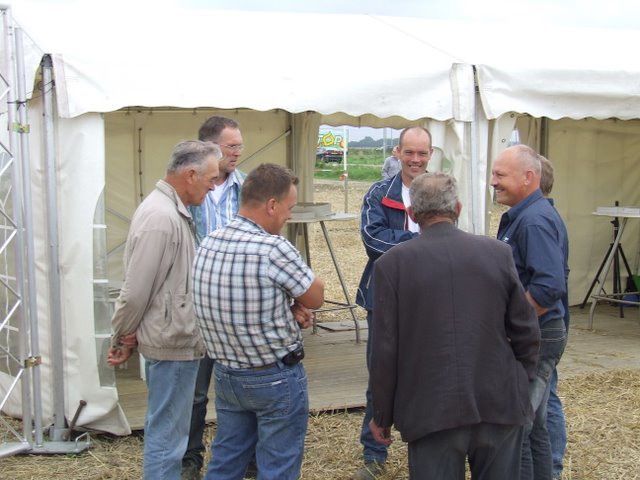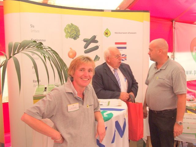 Rob van den Bos(Bejo Zaden), Brenda Schmidt, Wim Menu (beide De Groot en Slot) praten de Belgische teler Dirk Vanparijs bij.