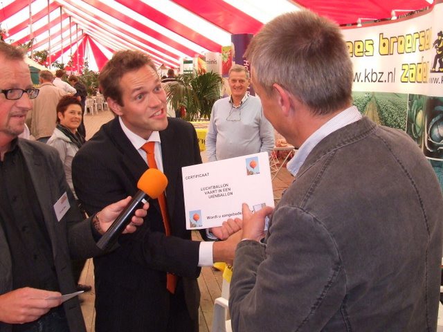Theo Menting werd de gelukkige winnaar van de luchtballonvaart in een uienballon, georganiseerd door AGFPN. Auke Heins reikt de prijs uit.