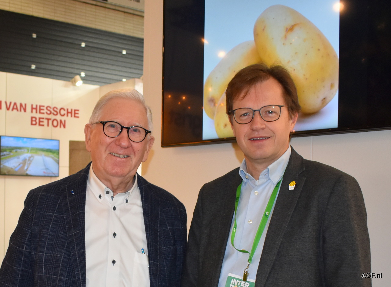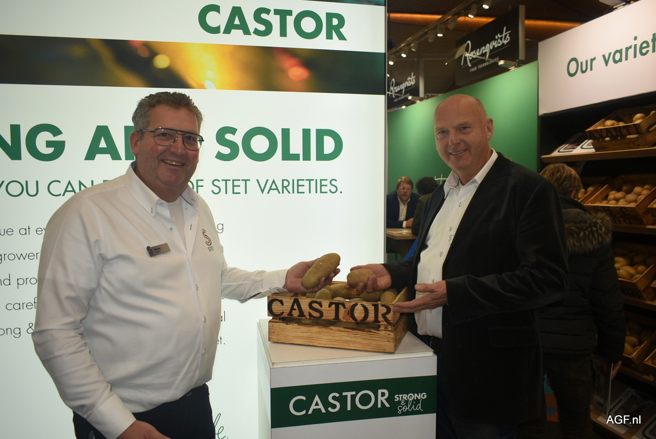 Walter Testers en Jos Scholtens van Stet Holland. Hier poserend met haar nieuwe ras Castor. "Ideaal om tot friet te verwerken", zo stellen de twee.