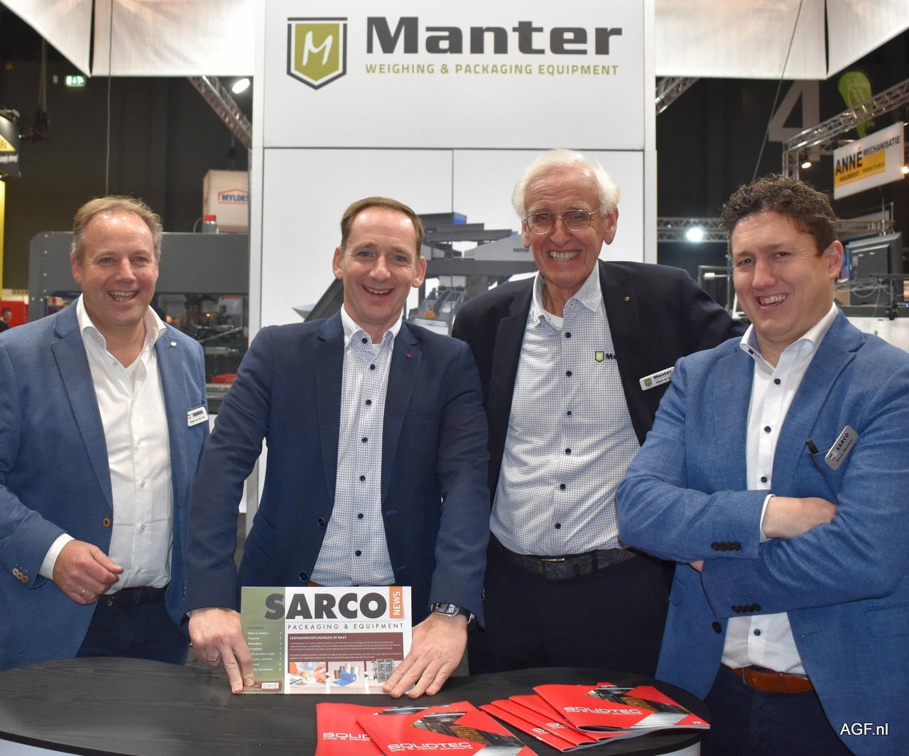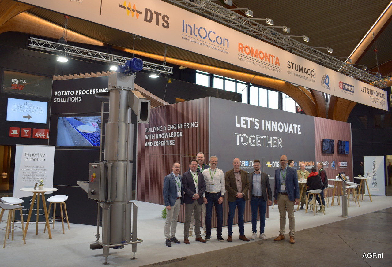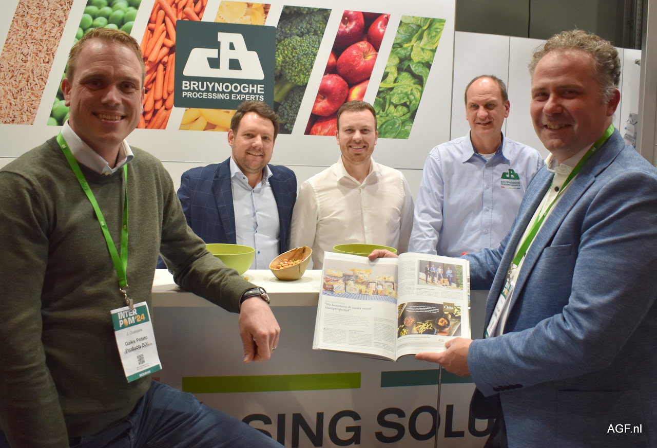 Rémy en Emiel Tanghe van RTL Patat en RTL Onions met Boudewijn van Fraassen en Mario Nieuwenhuijse van LC Packaging. Mario met de beursspecial van Primeur in de hand: 'die ga ik vanavond eens fijn lezen'.