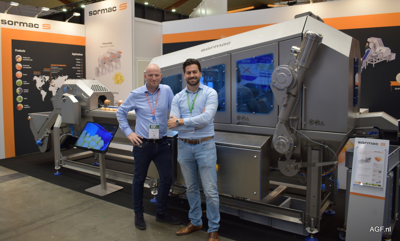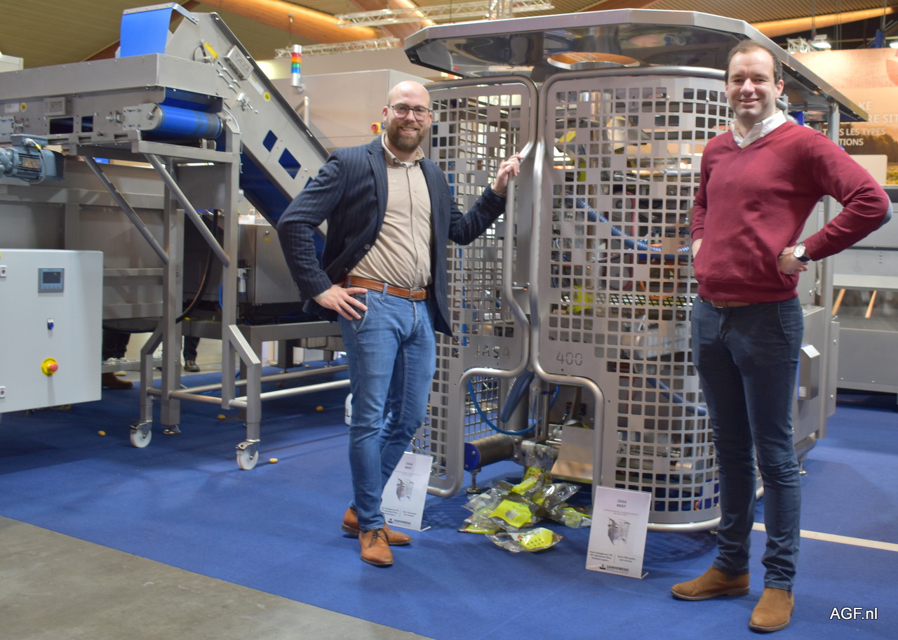 Lars Heuvelmans en Jesper Strocken van Sormac BV poserend bij de nieuwe hygiënische uienschiller USM-H 100