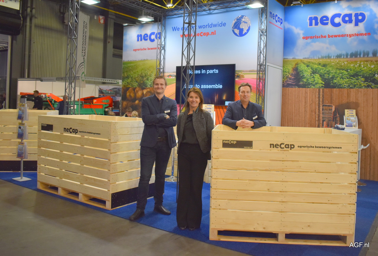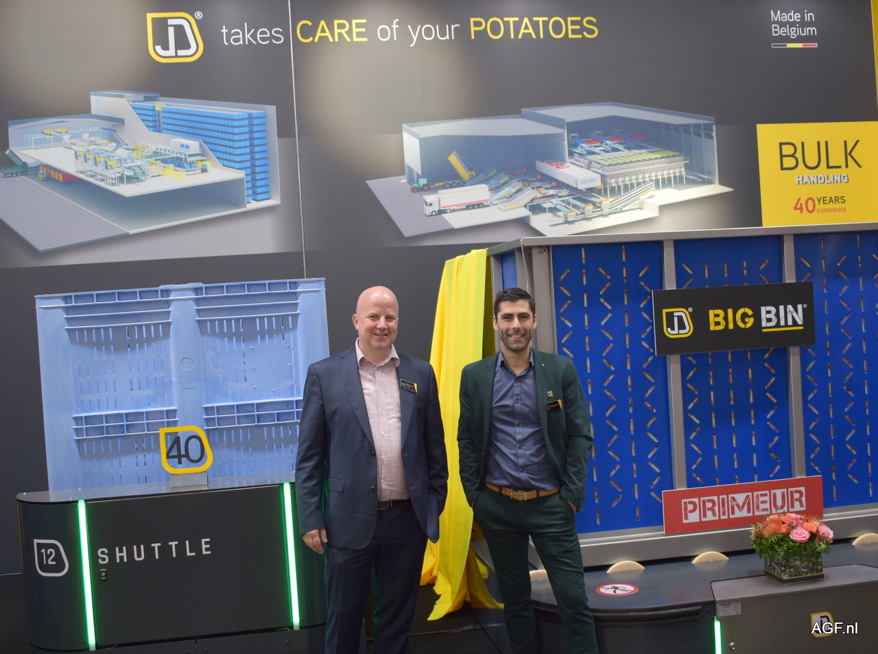 Mattias Mergaert en Justin Bruggeman van Deprez bij de Big Bin Potato Handling. 4700 liter inhoud heeft de Big Bin die past in het volautomatisch transportsysteem van non-stop vullen, ledigen en bewaren in stellingen.