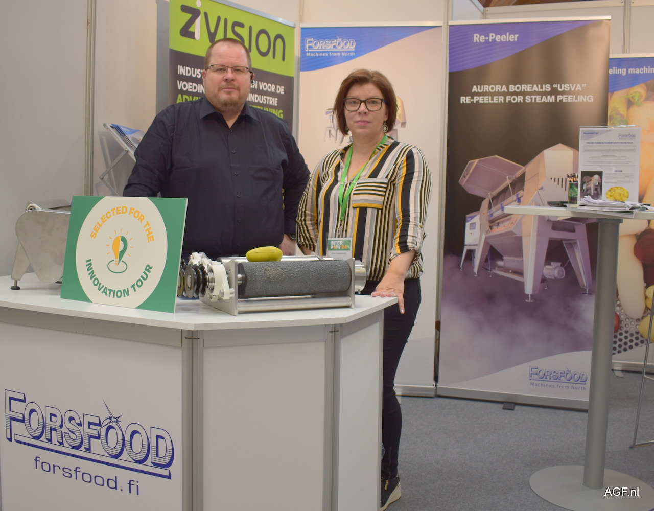 Rune Sars en Anita Keskikoivisto van Forsfood. Aurora Borealis Peelers. Naast carborundum rollen leveren zij ook rollen met mesjes voor een zeer dunne schil.