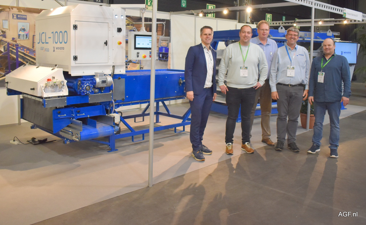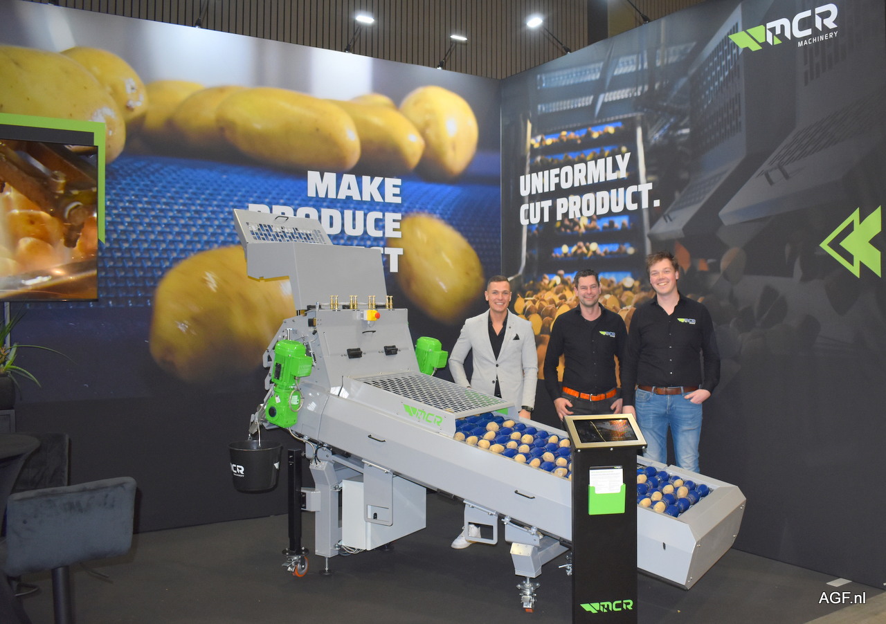 Jan Willem Lambregtse, Jan Pieter Reijnoudt en Niek van der Vlies van MCR Machinery poserend bij de nieuw geïntroduceerde pootgoedsnijder.