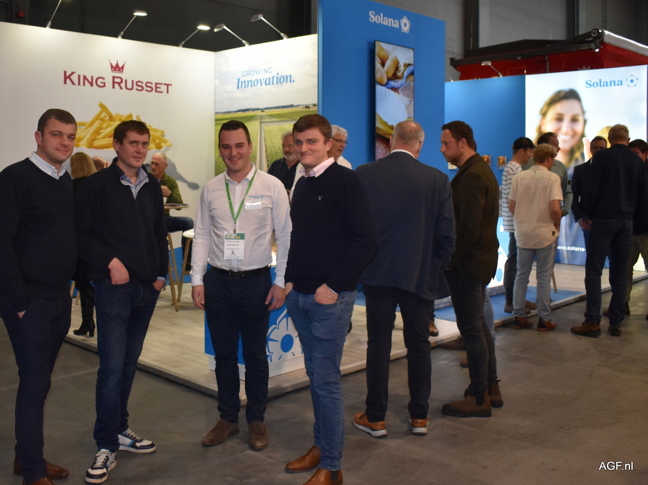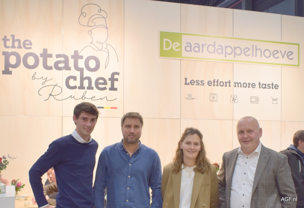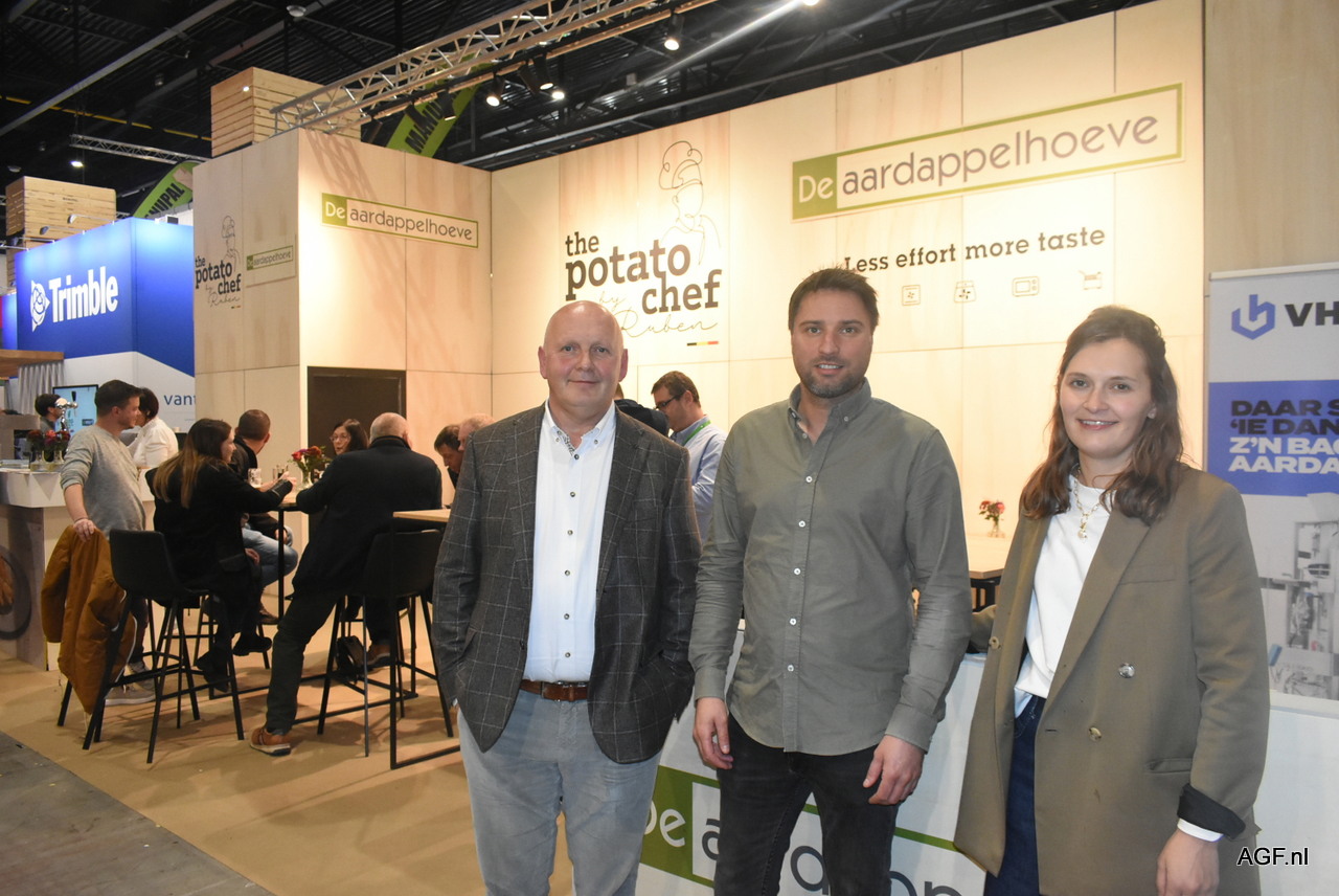 Bart Nemegheer, Wouter Devlies en Ellen Nemegheer van De Aardappelhoeve. Op de uitgebreide stand stond The Potato Chef, het conveniencemerk voor verwerkte aardappelproducten, centraal bij het bedrijf.