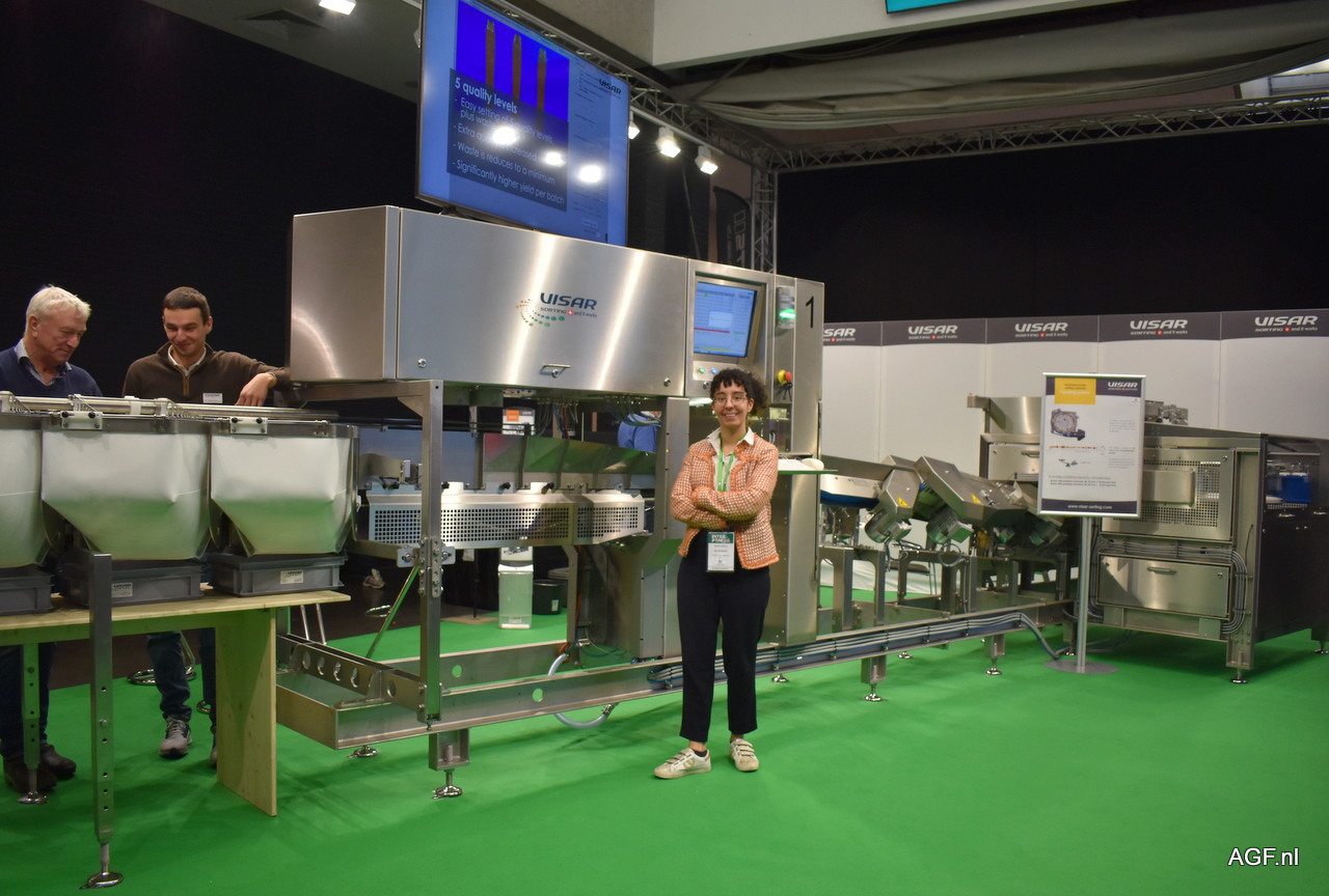 Marine Geffroy van Visar Sorting poserend bij de Sortop optische sorteerder voor bv wortelen en aardappelen met 10 uitgangen.