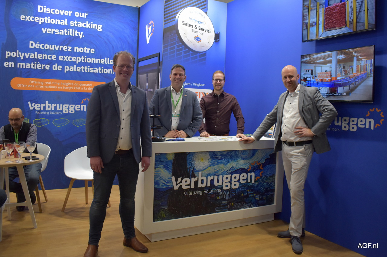Daniel Noorland, Johan van der Reest en Rutger Verbrugge van Verbrugge Palletizing Solutions. Jouke Aalvanger, 3e van links, werkt voor Eqraft en kwam even buurten.