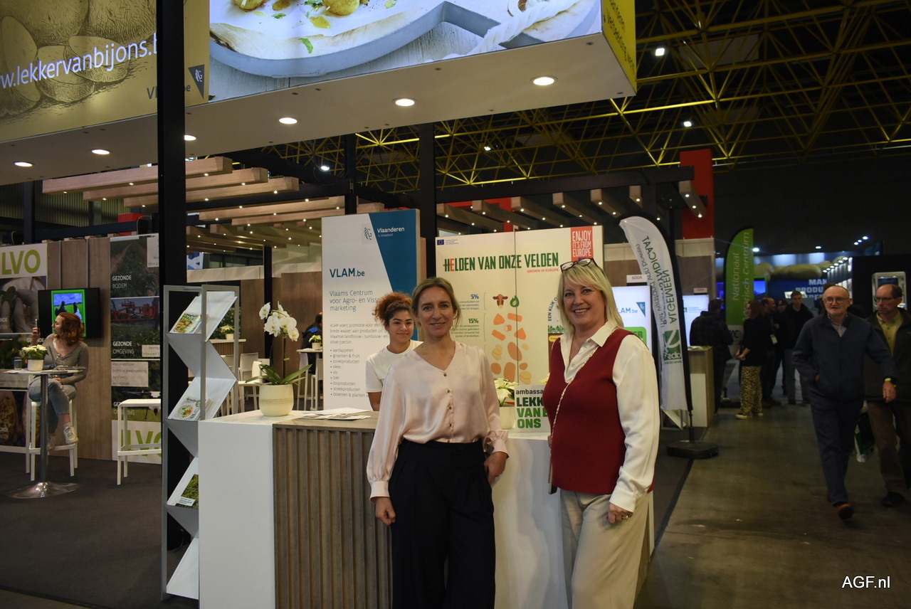 Katrien De Nul en Betty Slingers van VLAM. Geen uitgebreid paviljoen met groenten en fruit deze keer, maar aardappels in de spotlight.