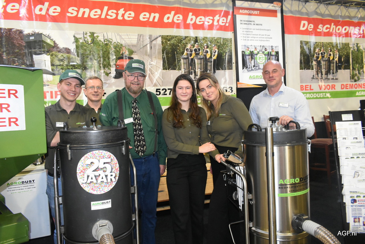 Het team van Agrodust, gespecialiseerd in industriële stofzuigers. In de spotlight het 25-jarig bestaan van het bedrijf, waarbij het verschil tussen de eerste en laatste stofzuiger de ontwikkelingen lieten zien.