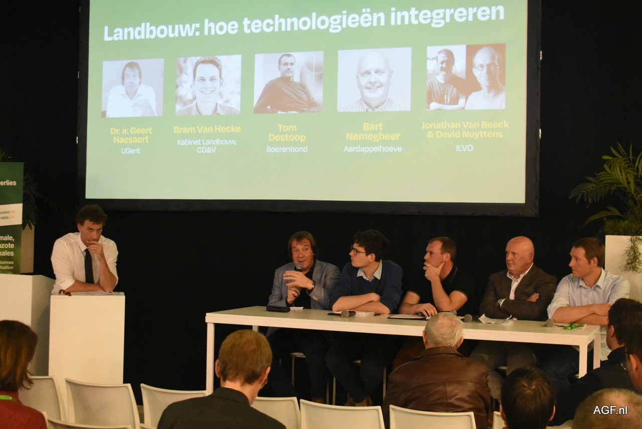 In hal 6 was er plaatsgemaakt voor een panelgesprek over data en technologie in de landbouw. Onder leiding van Christophe Vermeulen (Belgapom) gaven Geert Haesaert (UGent), Bram Van Hecke (Kabinet Landbouw van CD&V), Tom Destoop (Boerenbond), Bart Nemegheer (De Aardappelhoeve) en Jonathan Van Beek (ILVO)