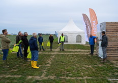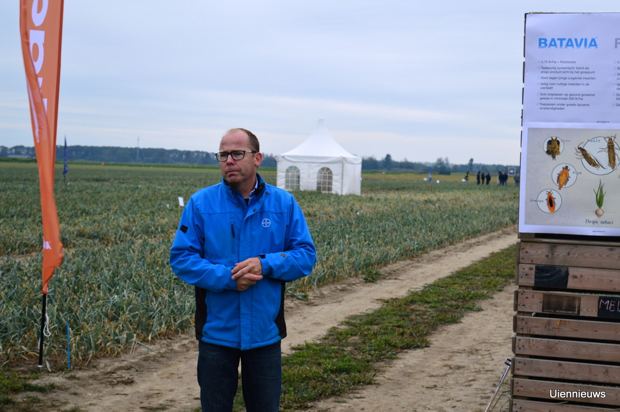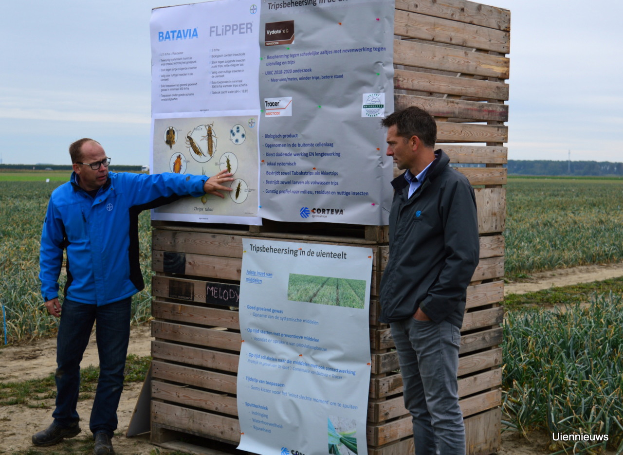 Mark Ermers van Bayer staat samen met Wobbe van der Veen van Corteva. Ze geven toelichting voor het bestrijden van insecten.